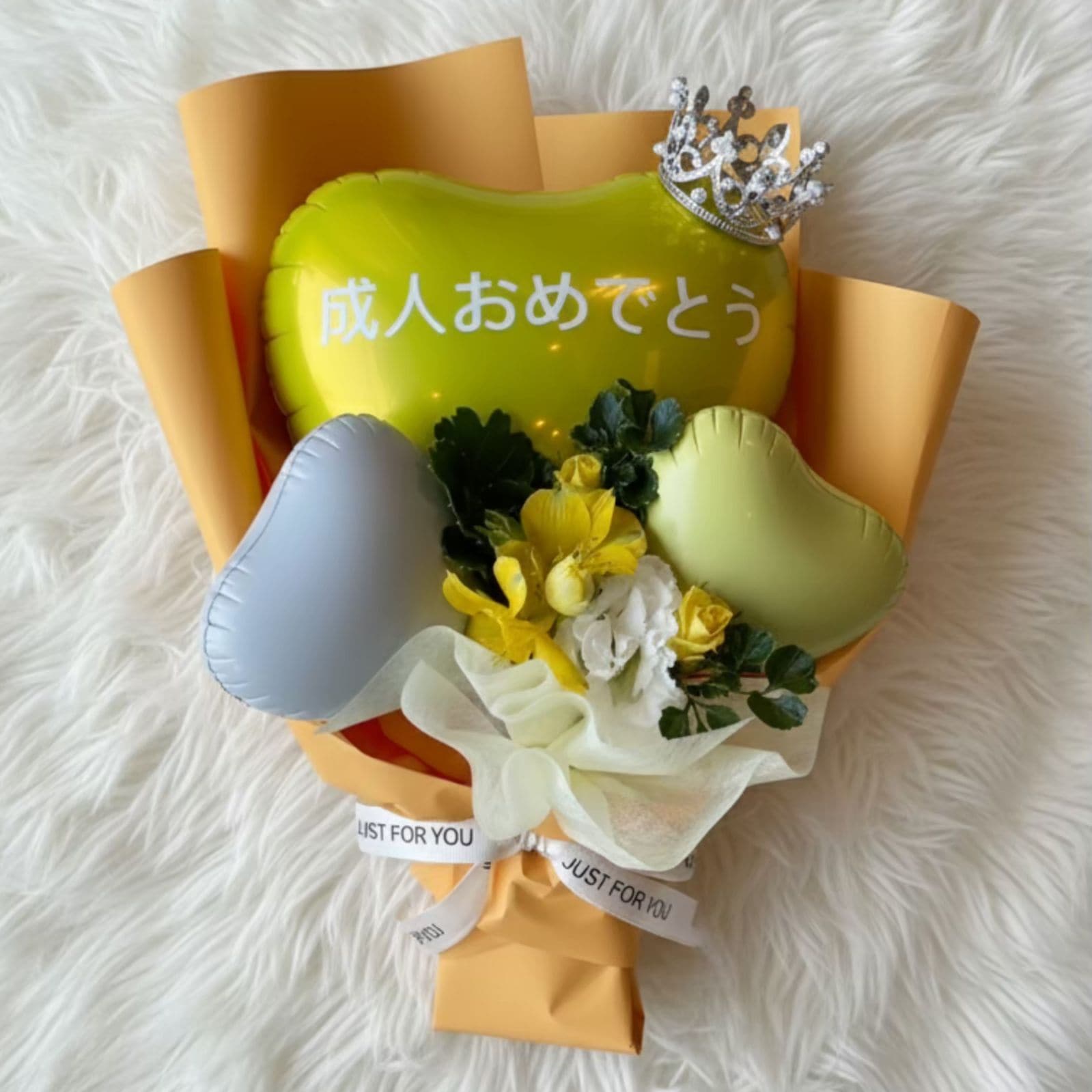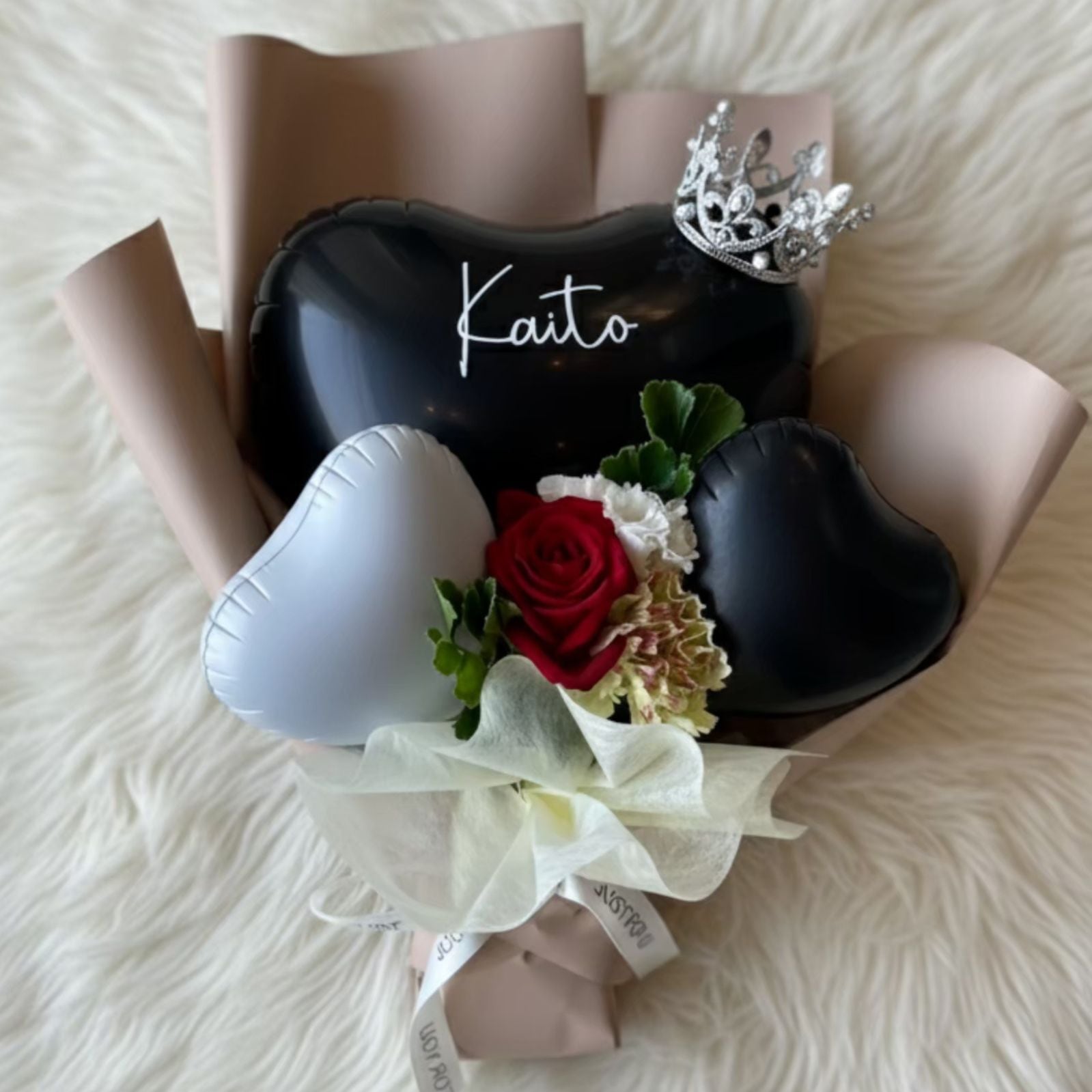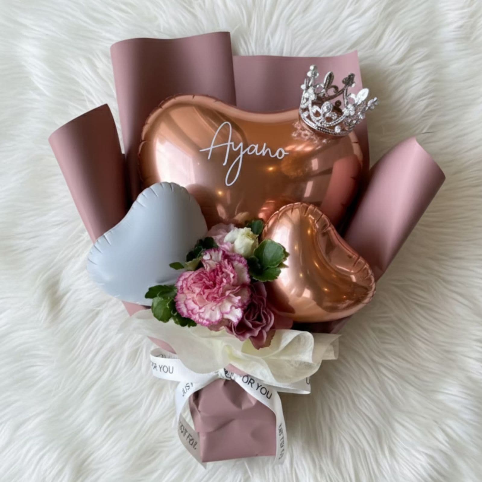 3つのぷっくりとしたハート型バルーンを組み込んだ、華やかでボリュームのある特別な花束です。