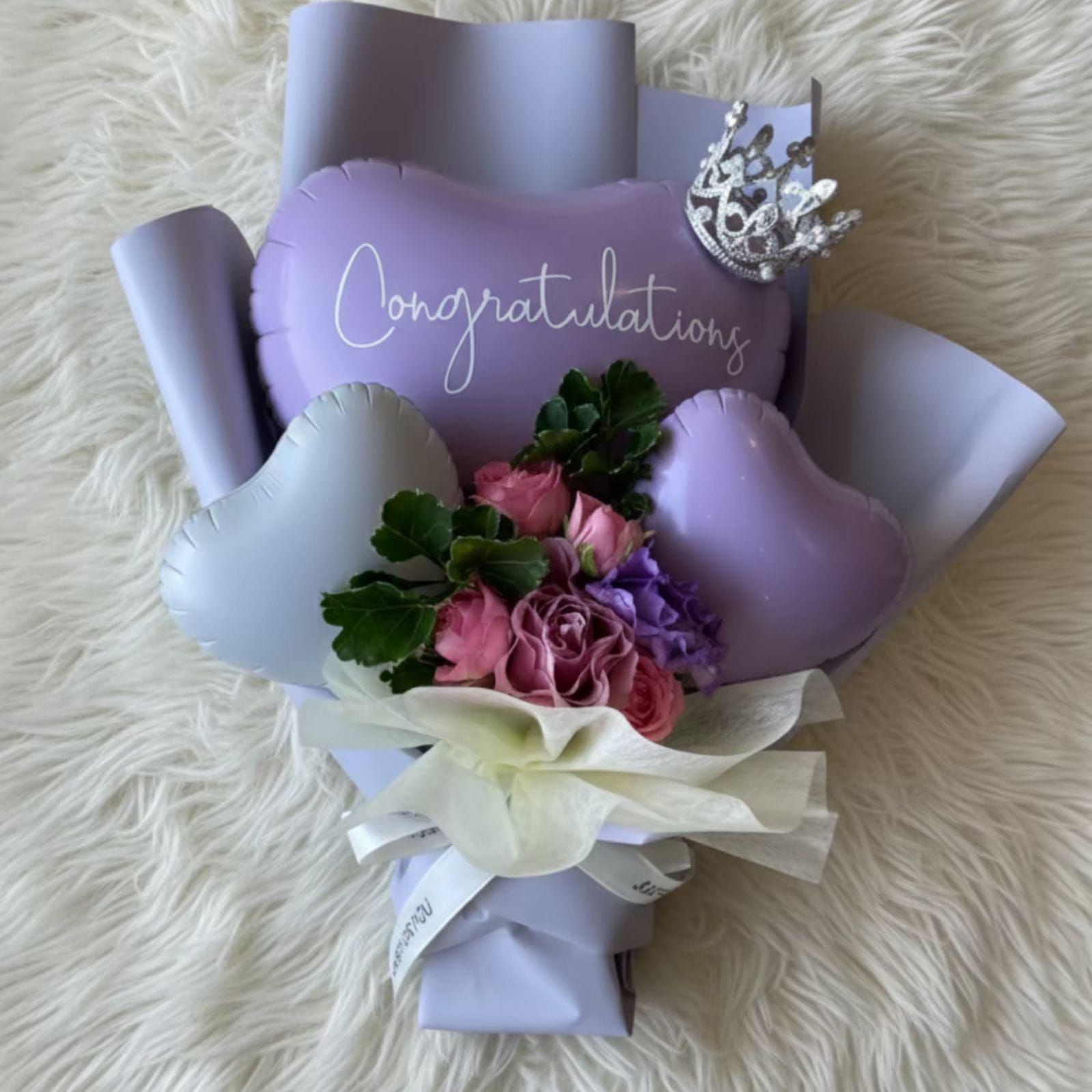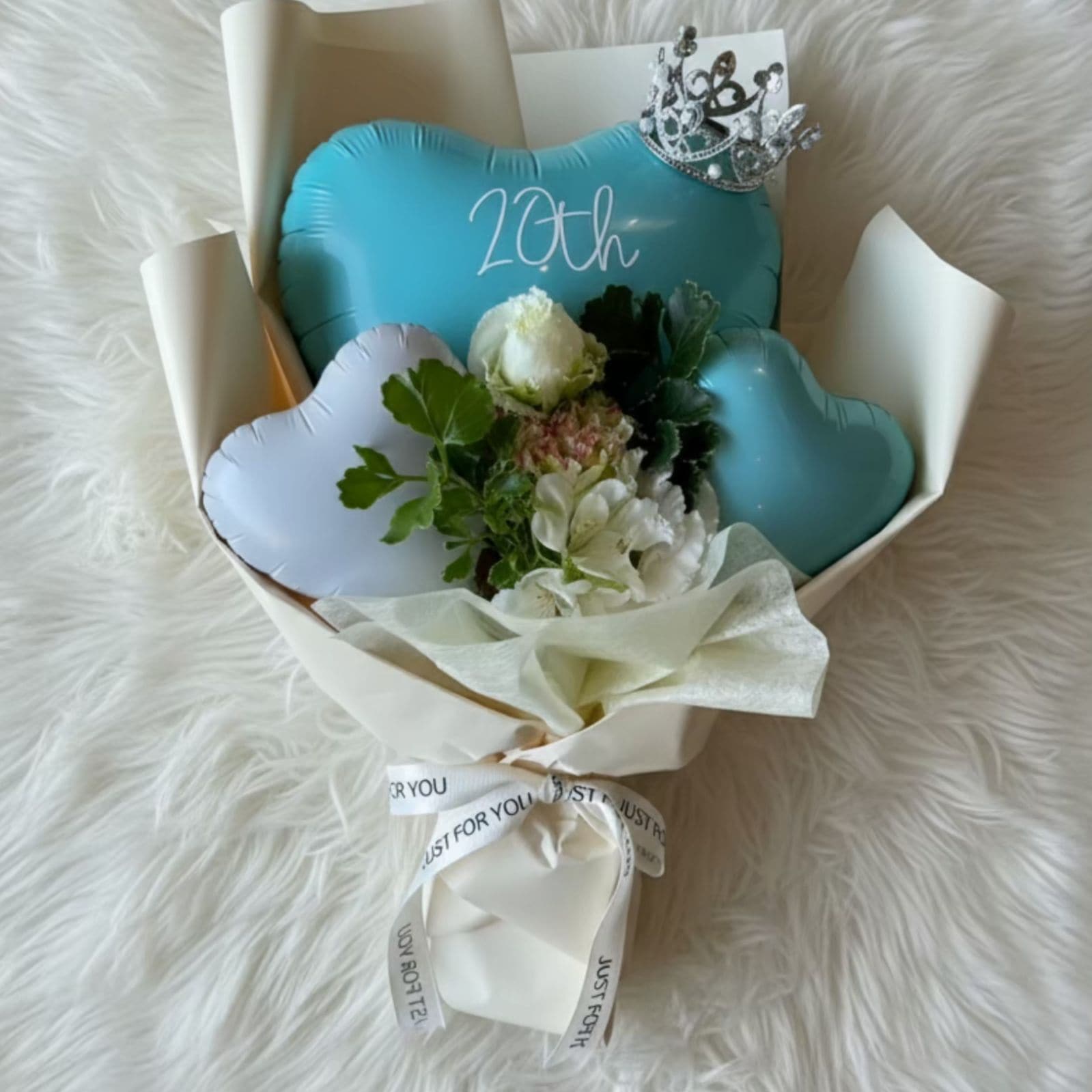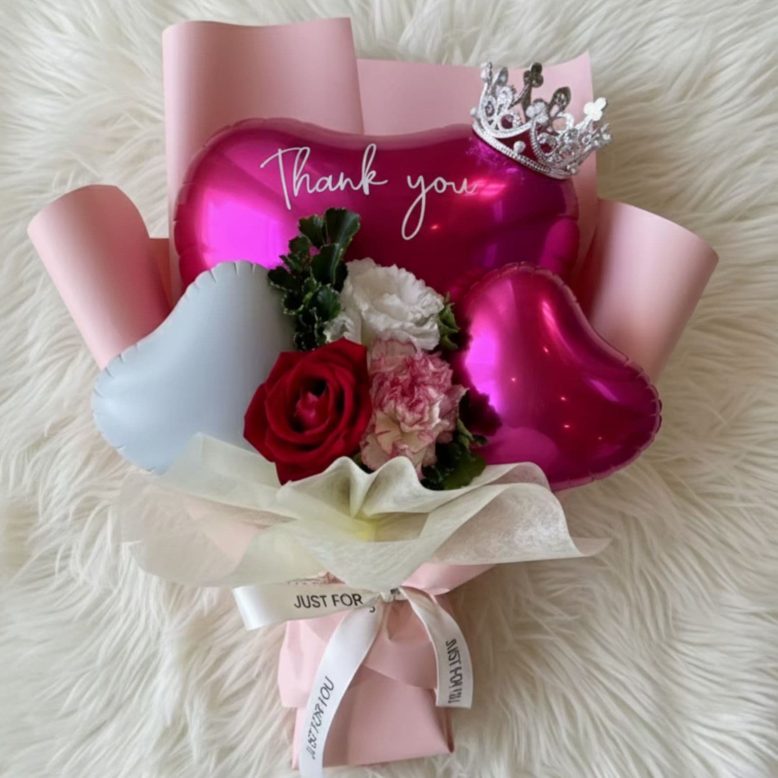 3つのぷっくりとしたハート型バルーンを組み込んだ、華やかでボリュームのある特別な花束です。