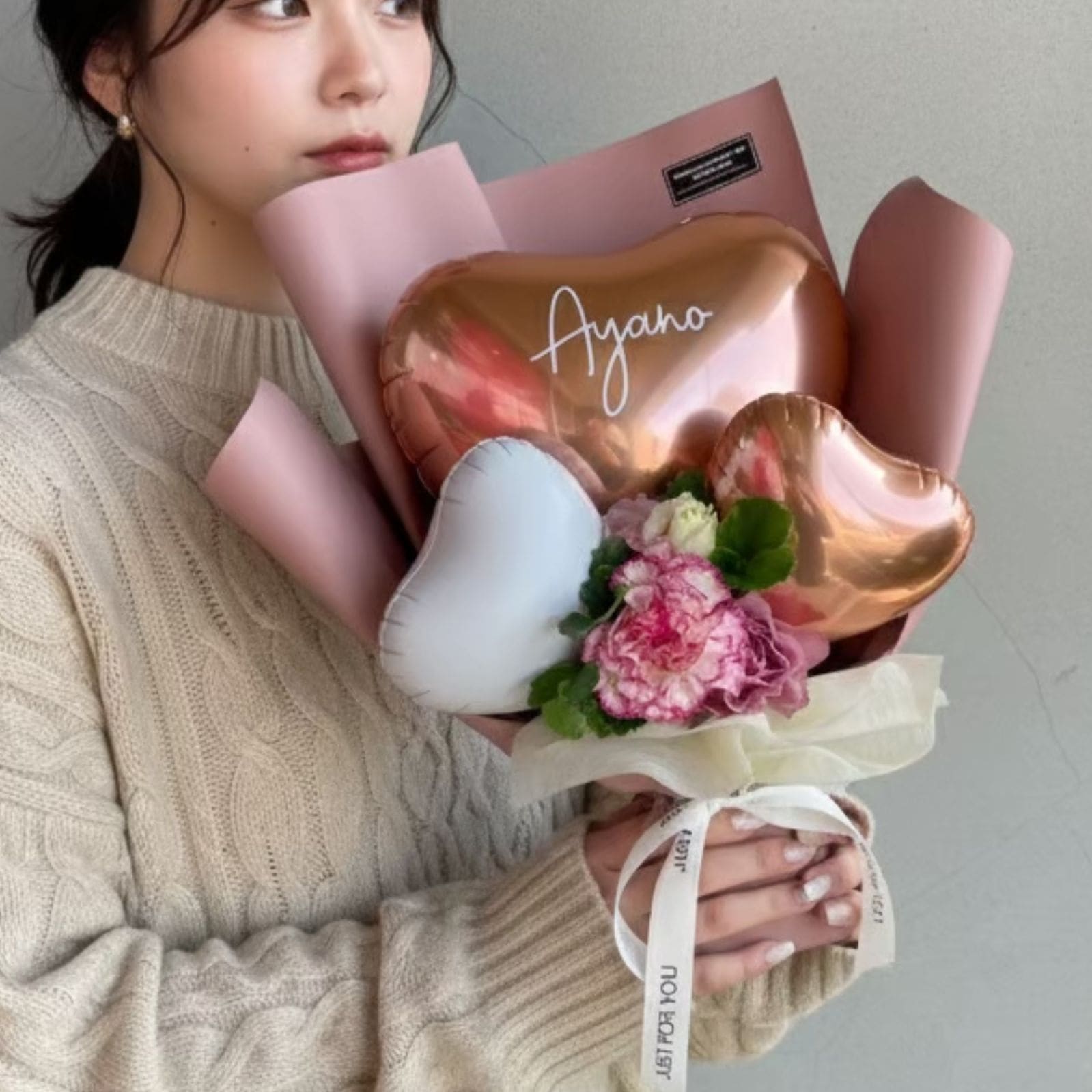 この花束の最大の魅力は、バルーンにローマ字でのお名前入れ(名入れ)が無料でできること。大切な方へ贈る、パーソナライズされた唯一無二のギフトになります。