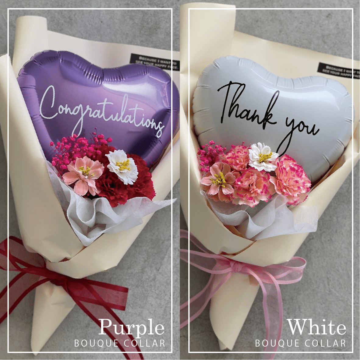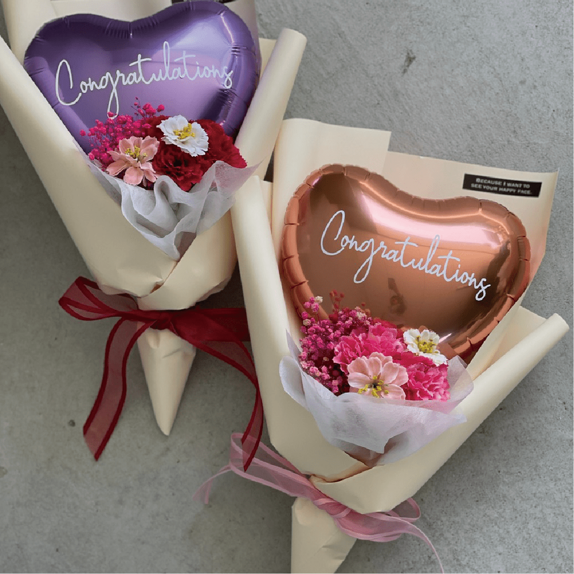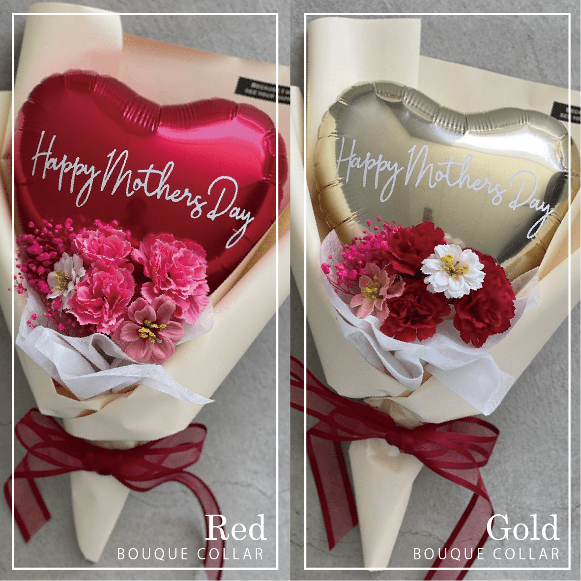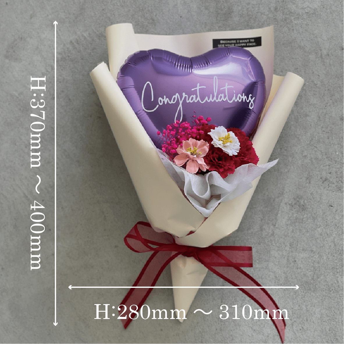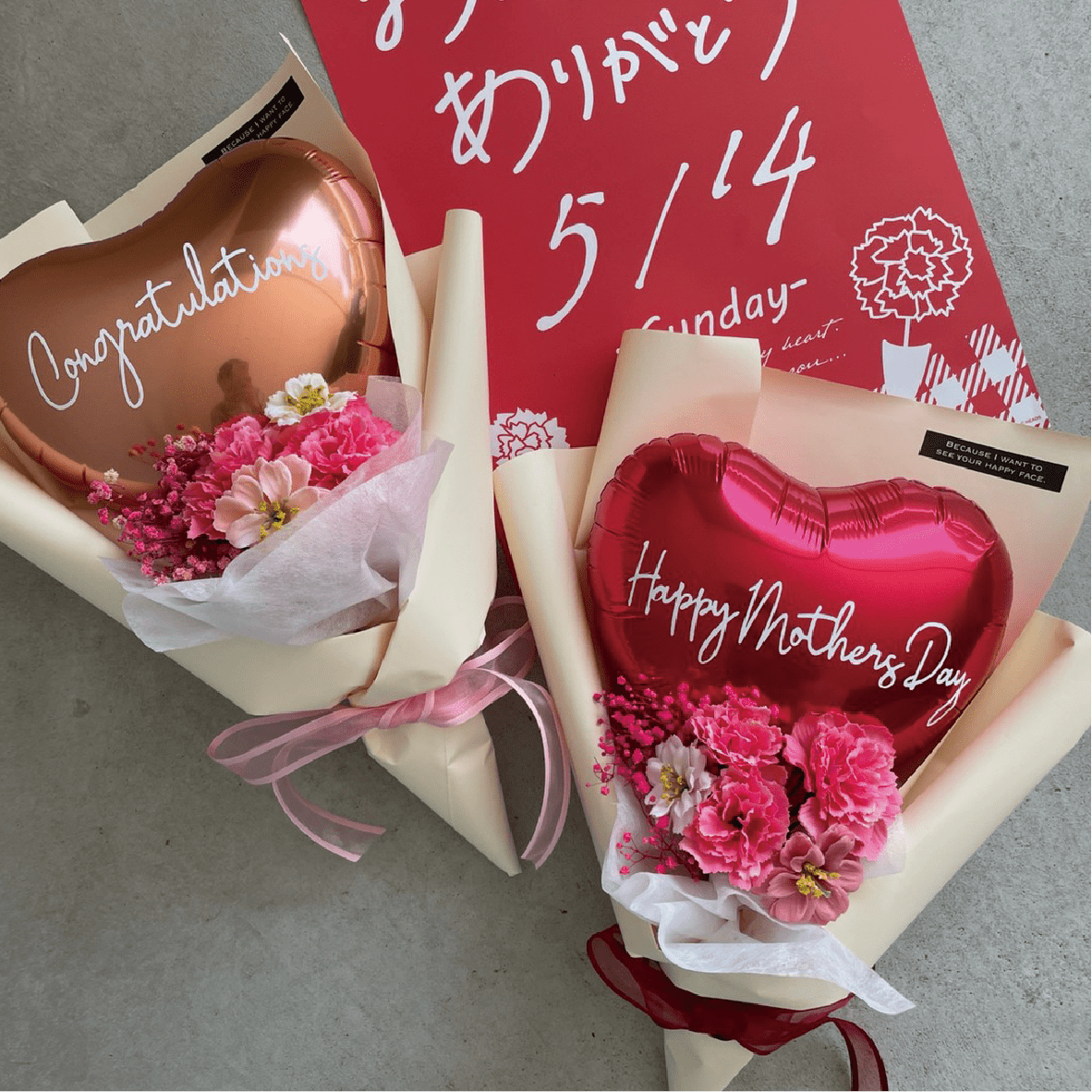 ★母の日にオススメ★ ハートバルーンをメインに、カーネーション等を添えてみました♪ お子様がもっても程よいサイズのブーケです♪ 【使用花材】 カーネーション〈造花〉/その他の花〈造花〉〈プリザーブドフラワー〉 ※花材や包装資材は仕入れ状況により、変わります。 ※画像はイメージです。手作りの商品ですので個体差が生じます。 【バルーンシールについて】 ※シール選択項目以外の文字シールの作成は出来ません。