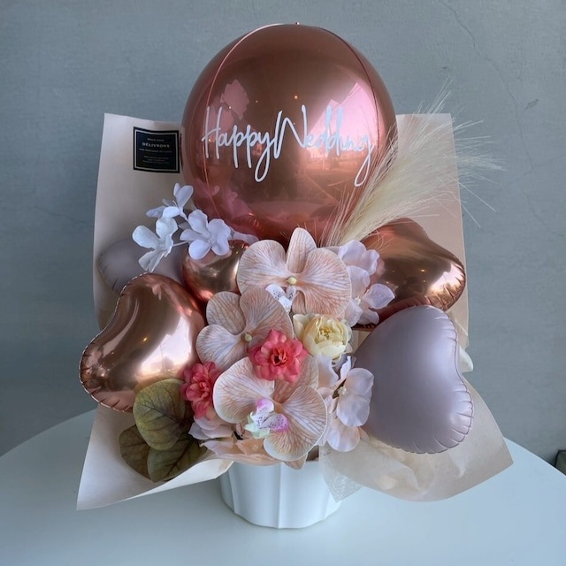 大きな気球型バルーンをメインに、ハート型バルーンと上品な造花を組み合わせた華やかなアレンジメントです。誕生日、結婚祝い、推し活、母の日など、さまざまなシーンにおすすめです。